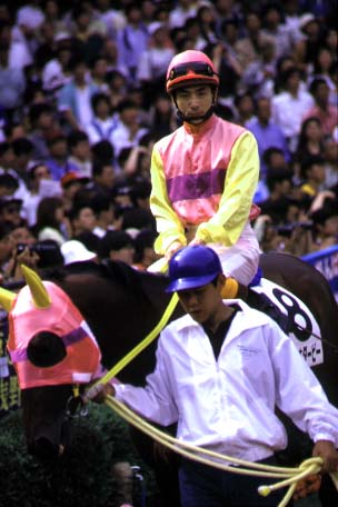いよいよダービー ピンクのメンコが輝いているダービー馬サニーブライアン 皐月賞ではスローペースを予想して本命にしたがこの 日は元気がないような気がして枠で押さえたのみ。ただし 本命はメジロブライト。 あとからこの写真を見てこの大西騎手の落ち着きぶりと サニーブライアンの気合が見抜けなくて落胆しています。 とにかく逃げ宣言をして見事に逃げきったサニーブライアン と大西騎手おめでとう。 骨折による3冠の夢は実現しなかったけどトウカイテイオー の様な復活を期待しています。 |