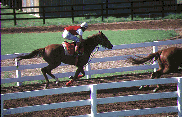 左はいっしょに行った山下君とブルーラグーンのスナップ。 (俺の方がスナップが多いのに写りが悪い) この馬はおとなしいとのことで鼻面をなでたり草を直接手から食べさせ たりと楽しい時間を過ごしました。 草を食べたのが久しぶりだったみたいで,脚でかいて「くれ」と要求し たり厩舎に入った後は首を上下に振って要求したりとまだまだ幼いと ころも見せていました。 こんなにおとなしいのがいけないのか根性がないのか美浦に入厩した らみっちり鍛えてもらって早く勝利の美酒を味わせておくれ。 | |