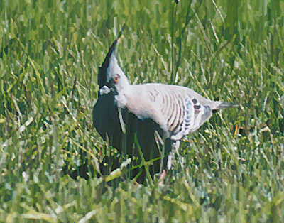 We (my wife and I) called this bird "Crowned Pigeon" during our stay in Australia, but it was not right. Crowned Pigeon have a more flamboyant crown. Crested Pigeon's head ornament has something jocular, and the bird is a bit soft in not only the ornament but also the head.