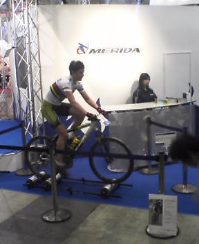 MERIDAのブースでは、女子MTBの世界チャンピオン、ガン・リタ・ダール選手がローラー台にて実演。