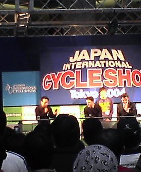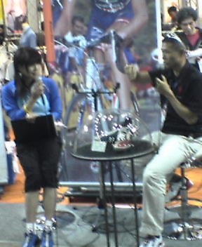 PearlIzumiのブースでは、男子MTBアテネオリンピック日本代表の竹谷選手がシューズに関する話をしていた。