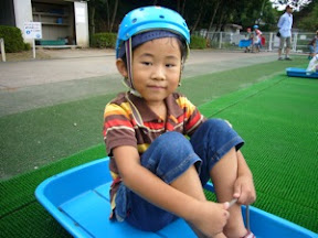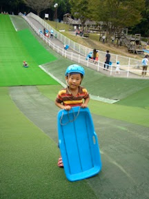 この連休はちょっと遠くの公園まで遊びに行ってきたよ。なんとココには人工芝の滑り台があるんだけど、そこでみんなで遊んでみたくて行ってきマシタ。滑るのは無料!しかもヘルメットとソリも無料で貸してくれマス。