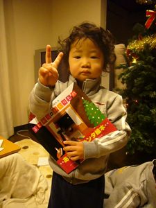 次はソウタ。寝ぼけていて良くわからないけど、サンタからの絵本のプレゼントを抱えてポーズ。まだまだクリスマスのイベントの意味がどの程度ソウタ本人が分かってるのか...不明。