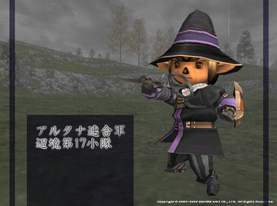 20年前のクリスタル戦争中〜末期くらいの設定で。連合軍といえども三国混合の軍隊があったのかどうかは、どうやらかなり怪しいのですが、どうせなら混合の軍隊の方が面白かろうということで、種族混合小隊になっております(まあ17とか適当な数ですが)。キャラクターの職業と種族、フェイスタイプは、挿し絵というか挿しSSに都合が良いように(笑)、身近な方々をモデルに使わせていただいております。