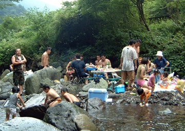 この夏の時期、隣接するキャンプ場でキャンプをする人や、清流に涼を求めてやってくる人達などで結構な賑わいを見せる。ということで、Prettyの先発隊(監督、まっぱ55、ローリー)も朝6時に下界を出発して陣地を確保していた。まったく、飲むことに関しては用意周到なPretty軍団である。