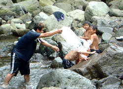 by たく大人達はと言いますと、いいかげん良い感じに狂ってきて、子供達が遊んでいる川に飛びこんで(と言うよりも、落とされていたと言った方が正しいような気がするが・・・。毎度思うのだが、なぜ水に落としたがるのだろう?)行きはじめた。1番はしゃいでいたのは、全員一致であきらだと思うけどね。Pretty監督が随分と大人しかったのは少し拍子抜けしましたが、やっと大人になったということにしておきましょ。