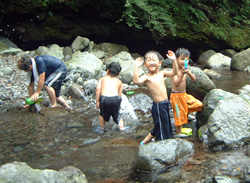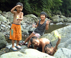大人達が荷物を開いていると、子供達は早速目の前の川に飛び込んでいきました。クッー、水はかなりの冷たさである。流れはあるものの深さはそれ程でもないので子供達にも安全そうである。溺れる心配があるのは我が娘あとむ(1歳8ヶ月)ぐらいのものだろう。しばらくの間、子供達と遊んでいると買い出し部隊が到着した。