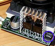 それぞれ拡大してみると、下駄には「KPC−R」と「HK6LCL−AA」と表示が書き込まれている。ODPの型番はシールで張り付けられているので、他の下駄などから推測すると、「HK6LCL−AA」が下駄の型番であろう。 この下駄には写真からみてもわかるように、丸で囲んだところ以外に設定スイッチがないことがわかる。ここで倍率を切り替えている。残念ながら電圧の変更スイッチはなく、2.2V固定である。 |