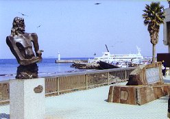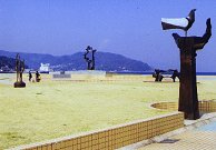 | 対岸の、なぎさ公園には、さらにシュールな彫刻群が。 背景は初島や真鶴半島なんですが、 不思議と違和感は感じませんでした。 3人の少年たちが、スケボーを楽しんでおりました。 |