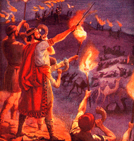 7:19 ギデオンと彼の率いる百人が、深夜の更の初めに敵陣の端に着いたとき、ちょうど歩哨が位置についたところであった。彼らは角笛を吹き、持っていた水がめを砕いた。