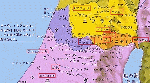 7:14 ペリシテ人がイスラエルから奪い取っていた町々は、エクロンからガトまで再びイスラエルのものとなった。イスラエルはその周辺の村々をもペリシテ人の手から救った。イスラエルとアモリ人との間は平和であった。