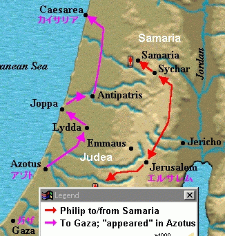 8:40 フィリポはアゾトに姿を現した。そして、すべての町を巡りながら福音を告げ知らせ、カイサリアまで行った。