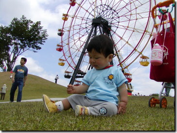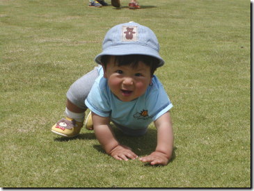 恵太はまだ歩けないので芝生をハイハイして楽しんでいました。おなかが空いたのか芝生も食べていたょ |