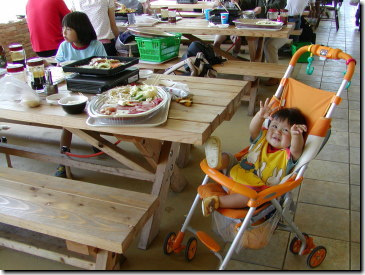 【昼食】 レストランは、カフェテリア形式で食べられるコーナーとバーベキューのコーナーがあります。今回は、バーベキューを利用しました。スーパーで食材を買う感覚で食べたい素材をカゴに入れてレジで料金を払います。ファミリーセットメニューもあり大家族でもお得です。座席の数も結構あるので土・日の混雑している時でも大丈夫です? ※恵太はまだお肉が食べれないのでパンとじゃがいもで我慢しました。 |