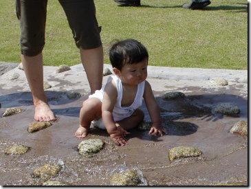 この日は、千葉も28度と真夏の暑さ。千佳と恵太は水遊び場を見つけると我慢できずご覧の通り。 |
