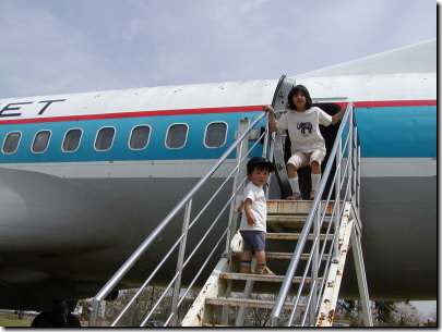 館内に展示されている飛行機の操縦席でパイロット気分を味わう恵太