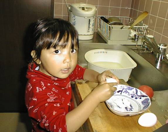 最近、お母さんのお手伝いをしています。今日は、ゆで玉子のからむきをして見ました。何個かむくうちにキレイにむけるようになりました。今度、むいてあげるネ。