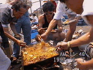 出来上がった「焼きソバ」に群がる男衆。作っても作ってもすぐに売れて しまう不思議で美味しいソバでした。 9:00より食べていましたが、 11:48でもまだ食べている人がいるのは何故? |