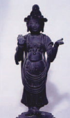 林ノ沢観音堂は享保10 年(1725)建てられ、内部には平安・江戸時代につくられた仏像が安置されています。右の写真は32 p位の仏像で、平安時代につくられた金銅仏といわれています。岩手県の文化財に指定され、大切に保管されています。 |