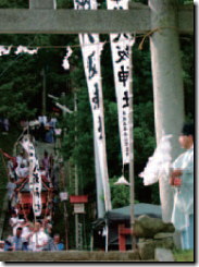 奥玉の旧村社で、例祭は旧暦6 月15 日です。今は「海の日」の前日に祭典を行っています。天王様と親しまれ近隣郷村より見物客で賑わいを見せ、当日は巫女の舞を奉納し、神輿はむかし神社が有った所まで巡幸します。鬱蒼とした境内東側には樹齢300 余年の夫婦杉が見事な枝振りを見せています。 |