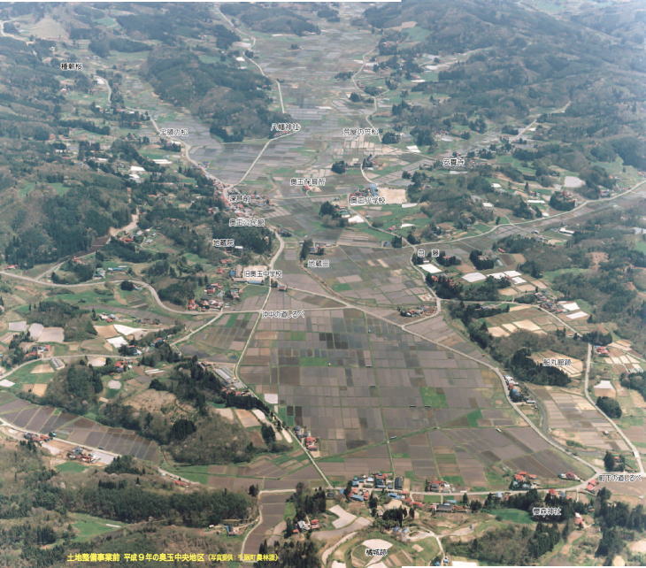 奥玉は、北上川の支流千厩せんまや川( 奥玉川または弓手川) 流域に位置している。奥玉川沿いは肥沃な土地で一般的に人の心は豊かである。地名の由来は、1278 年前の聖武天皇の時代に、奥玉と摺沢境の鶴ケ峰( 大東町摺沢字羽根折沢) より玉( 水晶) を採掘し、坂本宿禰さかもとすくねという住人が、宮城県多賀城の国司大野東人おおののあずまひとへ献上したと言われ、のちに興玉村が転訛し奥玉村になったと伝えられている。 その後、この玉は地中に埋めて祠を建て奥玉神社( 現櫻森神社) となった。これが奥玉村( 奥玉郷)の名前の起こりでもある。現在も櫻森神社の境内には奥玉神社があり、由来を記した安永5年(1776)建立の大きな「櫻森伊勢祠碑さくらもりいせしひ」が古色蒼然と建っている。 中世代( 領主は藤原氏)は磐井郡から独立した奥玉保といわれ、平泉を守る重要な経済特別行政区の「保」になっていた。その後、領主は鎌倉幕府高官の二階堂氏に移り、続いて金沢文庫の創設者の金沢氏が奥玉村の領主となった。 鎌倉幕府の滅亡後、奥玉村は葛西氏の広大な領国の一部となった。また、葛西晴信の戦国時代末期には上奥玉村・中奥玉村・下奥玉村に分村し「保」としての役割も終えた。 天正18 年(1590)、豊臣秀吉の奥州仕置によって葛西氏の統治は終わりを告げ、代って秀吉臣下の木村吉清が領主になった。しかし、葛西・大崎一揆によって木村氏が失脚、天正19 年には旧葛西領は伊達政宗だてまさむねが領知することになった。 伊達氏の藩政時代、大上奥玉村は伊達直轄領に、上・中・下奥玉村は一関の田村領になっており、安永4年(1775)に伊達藩に報告した大上・上・中・下奥玉村の地理誌「安永風土記御用書出」がそれぞれ宮城県図書館に残されている。 奥玉には、立花城たちばなじょう( 橘館・二日市館)・牛生蓮館ごしょうれんたて・此手館このてたて・殿金沢館とのかねざわたて・要道館ようどうたての中世城館跡が昔の姿を今に伝えている。 明治4年から、一ノ関県、水沢県、磐井郡、磐井県を経て、東磐井郡となり明治12 年に大上・上・中・下奥玉村が合併して奥玉村となった。 明治18 年の奥玉村の概要は、戸数426 戸・人口2,520 人。奥玉小学校の生徒数115 人( 男97・女18)。物産は米・大小豆・大小麦・紅花・蕎麦・生糸・馬鈴薯・葉たばこ・山林木材、等。 私たちが小学校入学の昭和25 年の戸数688 戸・人口4,454 人。中学卒業後の昭和35 年の戸数は731 戸・人口4,693 人で奥玉最多人口となった。 土地基盤整備事業は、昭和27 〜 34 年に5 e田となり、平成9 年に始まった現在の1 f田工事は平成17 年に事業終了する予定である。 安永風土記に見る奥玉村の一戸当り平均耕地面積は68.9 e、収量は10 e当り約100 s ( 現代と条件が違う) で町内平均値の4 割増で富裕であった。 奥玉には林ノ沢観音堂の黄金伝説があり、地名も「金取沢・金山沢」や苗字の「金・金野」も少なくない。また、吉立地区には「三枚山鉱山跡」があり、天正年間(430 年前)に金を採掘、昭和初期には高純度の金鉱石を産出した名所でもある。 昭和31 年町村合併で千厩町となり、平成16年10 月31 日現在では、世帯数4,191 戸・人口13,399 人である。平成17 年9月20 日より一関市・西磐井2町・東磐井6町村が合併し、総面積約1,320 ku、人口約150,000 人の県内第二の新『平泉市』へと移行する予定になっている。