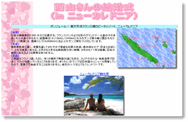 ・挙式日:2000/10/10 ・場所:ニューカレドニアの教会 ・新郎:西山 孝行 ・新婦:瀧沢 忍 ・二次会の模様:なし |