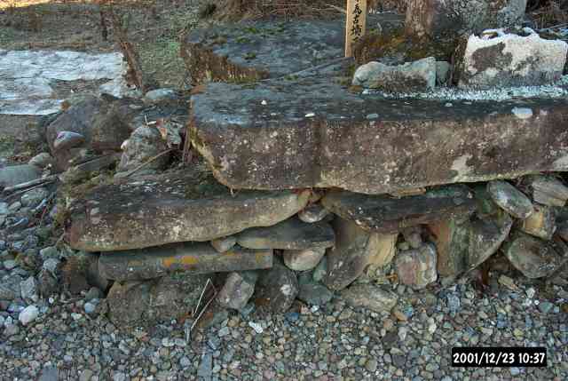 ![]() | 西から。7号墳の北近くにこのようなものが見られた。古墳から抜き取られた石棺あるいは石室材が積み重ねられたもののようだ。この位置に古墳があったのか、別の場所から運ばれたのかはわからない。「供養塔」と刻まれた石碑の直下にはかなり厚くて大きな、石室の天井石とも思える石がある。 |