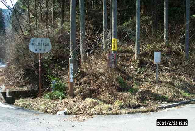 | 集落入口の消防倉庫から少し歩くと左手にこのようなスイッチバック式に登る幅1mほどの細い道に出会う。一見個人宅への入口に見えるが、実はこの道が集落内部と塚山への入口である。近くの猟犬を数頭飼っている家のご主人のお話では「俺がこの前行った時には膝まで雪があった」とのことだが行ける所まで行ってみることにした。 | ![]() |