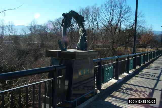 ![]() | 龍勢会館から椋神社に至る道の途中、吉田川に注ぐ阿熊川にかかる龍勢橋。鋳物製のリアル(?)な龍が鎮座。吉田町が推進する周辺道路等の龍勢祭シフト整備の一環として架けられたものだそうである。 |