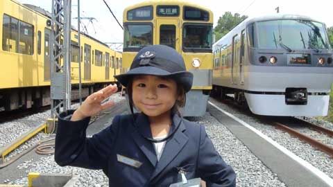 2両編成の電車と綱引きをして、コスプレ写真撮影