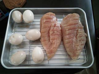 まずは下処理をした鶏肉の胸肉とゆで卵