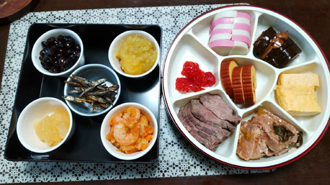 黒豆 キントキ 煮豚 ローストビーフ 卵焼き は作製 エビチリは家人
