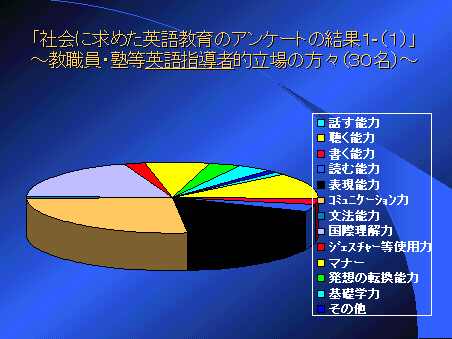 現場で盛んな「Speaking」に関してはあまり意識されていない。 4技能で言えばまず、Listening能力が必要と言うことである。また、「マナー」(6)についてもその裏に「学習意欲の欠如」等の深刻な生徒像が浮かんでくる。