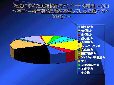 英語を学ぶ立場の方々でも、依然「表現力」(21)、「Listening」(21)、「communication」(19)、「国際理解」(11)が多いことに変わりはない。しかし、前二者と大きく異なるのは絶対数が少ない割に、「Listening」・「表現力」の支持が多いこと、また「Reading」(8)も多くなっている。特に注目すべきは「基礎学力」が6人で、その方々の中に強く"output弊害"を訴えて方がいたのが印象的であった。