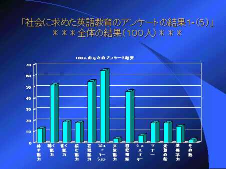 トータルでは「communication力」(65)、「表現の能力」(55)、「聴く能力」(52)、「国際理解」(46)、の順で支持が多く、後は「文法」「gesture」を除けばどんぐりの背比べである。
