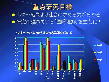 分析は難しいが、赤の40代の方々が全くいない箇所が「文法力」「gesture」「基礎学力」である。
