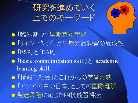 ・英語は技能面先行だけではなく、知識面の育成も忘れてはならない。学習の側面として「知識・技能・情意」とありその本質は昭和22年の改定以来変わっていないと言われる方もおられる。確かに現行指導要領(平成元年)の「コミュニケーション」の言葉以外熟読してみると何ら内容的には大きな差異は無いように感じられる。時代とともに本質の周辺が変化したり脚光を浴びたりしているのかもしれない。現行のものでは「情意面」に指導の焦点があてられている。情意面(関心意欲態度)を重視したとしても、技能・知識も大切であることに変わりない。特にこれらは発達段階に合わせて指導されれば解決することではないだろうか。英語学習のゴールに向かって、中学英語はその過渡期であり、入門期である。まずは基本的に全てを取り扱いつつも情意面を伸ばしていくことが必要だろう。段階的指導法を私は重視している。中学ではまず基本である。もし小学校に英語科が入って一般化したならばまた中学英語の役割も変わるだろうが、現時点では情意面を重視しながらも知識面も回避せず(『文法指導』という言葉が教育界でtaboo化している感じが個人的にしている)に指導していく必要があると思う。「まずやってみて体で覚えて、理論的裏付けをとる」という方法も必要かもしれない。sports界で良く行われる方法である。指導要領も戦後11回目の形に間もなく変わろうとしている。