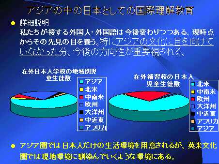 上記のグラフは何を意味するかと言うと、「在外日本人子女の文化的環境」である。周知の通り「海外日本人学校」は日本人が日本の学校のように通うもので、「補習校」とは土曜乃至日曜に週1回程度「現地学校」から離れて「日本語、数学等の学習をする」学校である。 つまり、アジア圏から帰国した生徒は現地のこと(文化民族性等)をあまり知らないで帰国する”可能性”(現地日本人学校の先生は現地交流を積極的に奨めていらっしゃいます。)があるが、欧米圏から帰国した生徒は現地を良く知って帰国する状況が生まれやすいことを意味する。