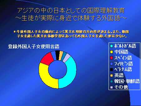 上のグラフは何を意味しているかと言うと、現在日本の公立学校で外国人子女が使用している言語を表している。つまり、学校や教室で実際に日常生活の上で生徒が耳にしている外国語とはポルトガル語や中国語の方が英語よりも多いのである。 実際に海外子女を受け入れている学校の教員が一番困るのが言語なのである。そこでは世界標準語の英語も役に立たないこともある。ベトナム語を学んだ教師もいるはずである。