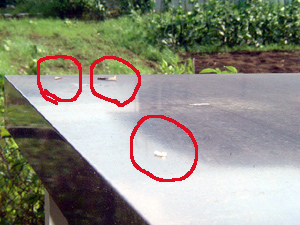| ここに引っ越して来た時、雨樋の所から藁のような物がはみだしていた。 「雀の巣?」と思い、チェックをお願いしたが、何も言われなかったのでただのゴミと思っていた。 ある日、庭からピヨピヨ声がする。「これはおかしい!」と思い、Tsuguさんにお願いし雨樋をチェックしてもらった。 Tsuguさんは頑張って雨樋を全部外し、ブンと振り回した。 すると、雨樋からすずめのひながぽろりと落ちた。「げげっっ!!」 |
