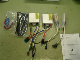 | 以前から欲しいけどなかなか手が出せずにいたHID。 やっとゲット出来ました!会社の後輩Nagooから出産祝いと日頃の御愛好をこめて!?と 言う事で頂きました。(強要した訳では有りません) 配線作業は超簡単。バラストの取り付け位置を悩みましたがドリルでウィーンって穴開けち まえば問題無し。 遮光板もSUS板で簡易作製。(→こんなんでいいのか?) 装着後の感想は・・・勿論GOODでしょう。ジー ジュッポッって点燈する瞬間が楽しい! |