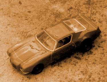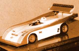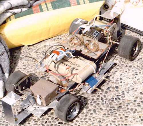 いわずと知れたタミヤの934です。76年の後半に発売されたこのモデルからすべては始まったのでした。シャシーはまったくのノーマルでしたが、「ラジオの製作」を見て自作したライトパッシングとウインカーを付けて喜んでいました。当初はニッカドを買う金がなく乾電池で走らせてました(^_^;) その後友人に売っ払い、しばらくしてまたまた購入。こんどは某所から友人がギッてきた(^_^;)非常誘導灯用のニッカド(Sub-C4本パック)を2組、計8本9.6Vで使用。シャシー剛性向上のためにシャシーの前後方向を2本のピアノ線で補強してました。