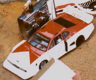さすがのBMWもズタボロになってきたので、当時まだ在庫があったエース・エンタープライズのボディを装着することにしました。価格は2500円。934はフロントブロックを前後にスライドすることで、ホイルベースの調整ができるようになっているのですが、最大に伸ばすとこのボディにピッタリなのです。ボディは赤一色ですが結構気合を入れて塗った覚えがあります。ホイルベースが長くなって操作フィールがしっくりいかず、レースは雨で流れた京商のいちむらでやったのに1度でただけ・・・