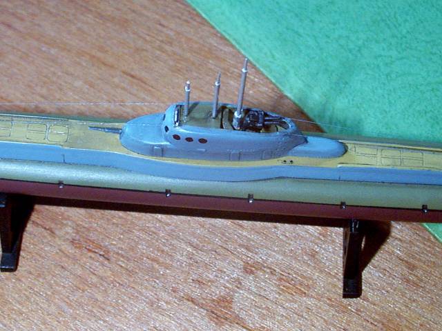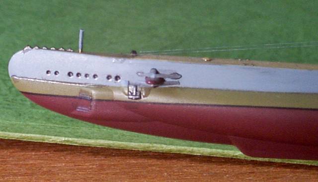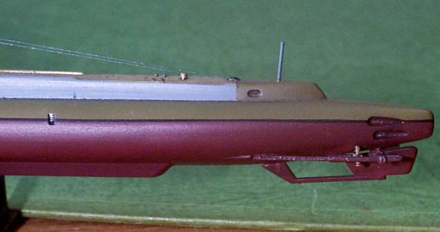 解決するには推進軸を切断し、真鍮線などで自作するとともに基部を延長してやればいいだろう。前部の潜舵ガードはキットのものをそのまま使用したが、やはりどうにも太すぎて実感を損ねている。目立つ部分でもあり、ここは真鍮線などでの自作を強くお勧めしたい。