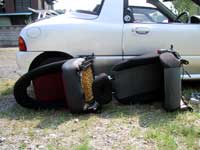 | 取り外された座席と取りつける予定の椅子の仲良く座席 | 運転席側座席を取り外した後 |
