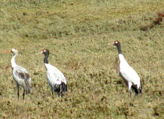 チベットで繁殖するオグロヅルは秋になるとヒマラヤを越えて、この地で冬を越します。緩やかに広がる谷間の湿地帯に昨年は322羽が越冬したそうです。今年は11/08現在104羽が確認されていると観察センターのガイドは言います。 併せて道路以外に立ち入らないことが徹底されます。ブータンの国鳥で絶滅危惧種でもあるオグロヅルもここでは安心して冬が越せそうです。 |
