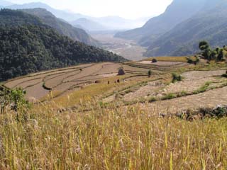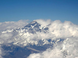 翌日私たちはカトマンズからブータンに飛びました。ヒマラヤの山沿いに飛ぶジェット機の窓からひときわ気高く大きなエベレスト(8,848m)を見ることができました。 1時間のフライトでブータン唯一の空港パロに到着です。ブータンは「GNPよりGNH(国民総幸福量)」を国の指針として掲げています。経済発展よりも自然や伝統文化を守ろうとする心が伝わってきます。 |