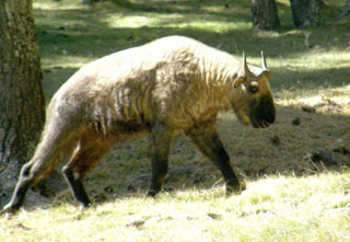 パロで1泊し翌日は車で首都ティンプーに移動します。首都といってもここには信号機がありません。珍しい首都といえましょう。 市街地の西に珍獣ターキンの放牧場があります。ターキンは山岳地帯に住む牛の仲間で、ブータンの「国の動物」です。 ここでターキンの保護増殖が図られています。春先には毎年かわいい子供が見られるということです。 |
