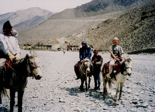 [10月16日] 前日まではまことに順調な旅でしたが、この日はルンルン気分が一挙に吹っ飛んでしまいました。いきなりのモン・ラ(ラ=峠 4,150m)越えが待っていたのです。標高4,000mを超えるとさすがに空気の薄さを実感します。標高差500mをやっとのことで登りきると今度はまた500mの急な下りです。さらにそこから400mあまりを登り返してドーレ(4,084m)までがこの日の行程です。4,000mを挟んでのアップダウンの連続には泣き言の一つも言わずにいられませんでした。 |