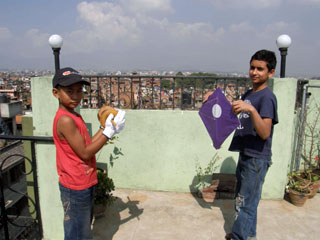 この時期ネパールはダサインの祭りの真っ最中でした。 ダサインはお祭り好きのネパールでも最大のお祭りです。 何しろお祭りが2週間も続くのです。この間大人たちは賭けトランプに 興じ、子供たちは凧揚げや花火に熱中します。 街の広場では踊りや音楽のイベントです。夜は親戚や友人を招いての 宴会です。おかげで私もいろいろな家でご相伴にあずかりました。 |